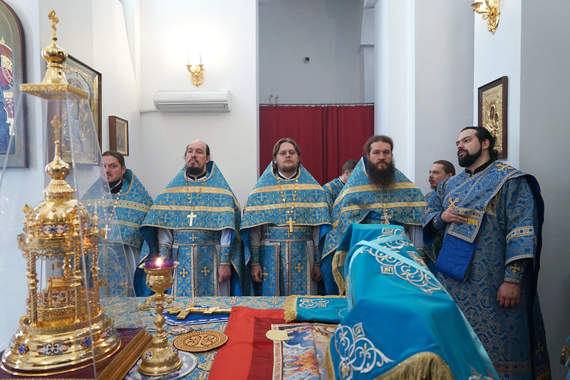 Им сослужили игумен Евфимий (Митрюков), старший священник, духовник монастыря игумен Пимен (Хеладзе), протоиерей Димитрий Усольцев, иерей Игорь Москвичев, иерей Роман Карпов, иерей Николай Генсицкий, иерей Александр Чеботарев, иерей Сергий Кузин, протодиакон Олег Дроздов, протодиакон Андрей Соснин, диакон Александр Аренков, диакон Роман Ахундов и диакон Дионисий Лавров.