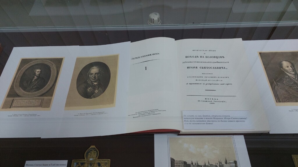 В этот замечательный день воспитанники воскресной школы храма Рождества Пресвятой Богородицы посетили выставку в Энгельской картинной галереи «Мудрое слово Древней Руси». Выставка посвящена 225-летию первого издания «Слова о полку Игореве», вышедшему в 1800 году в количестве 1200 экземпляров.